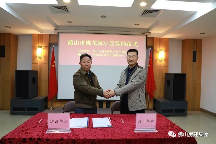 12月11日,鹤山市桃花园小区签约仪式在房建集团会议室举行,房建集团董事长颜琦、总经理何景辉、明华房地产董事长麦志明等同志出席仪式。