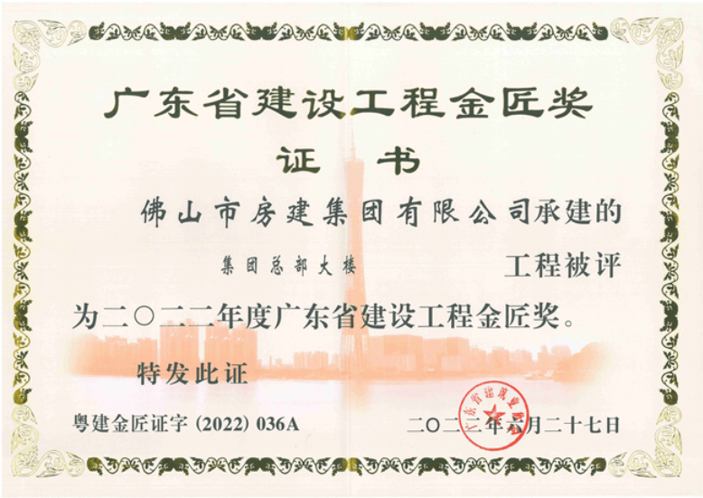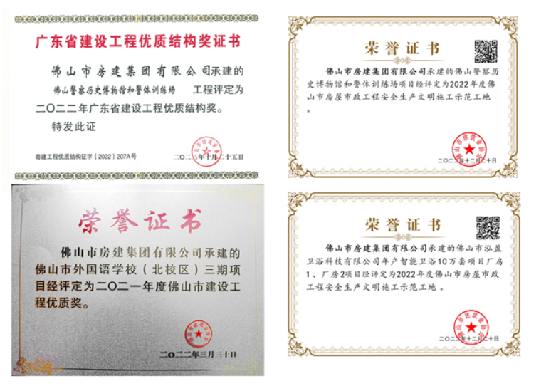打铁仍需自身硬,佛山房建集团一直秉承“精心策划、施工创新、信守合同、质量第一”的质量方针,严抓工程质量关,创先争优,建安心工程。过去的2022年,在全体房建人的共同努力下,“集团总部大楼”项目荣获广东省建筑行业工程质量最高荣誉的“金匠奖”,新城路项目获省级市政优良样板工程,另佛山市外国语学院、佛山市警察博物馆、佛山市弘盈卫浴厂房等项目分获省、市级奖项。