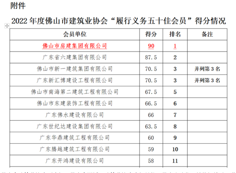 为推动建筑行业诚信体系建设,鼓励企业积极响应、支持、参与行业发展工作,佛山市建筑业协会举办“履行义务五十佳会员”评选活动,我司荣获2022年度“履行义务五十佳会员”第一名。