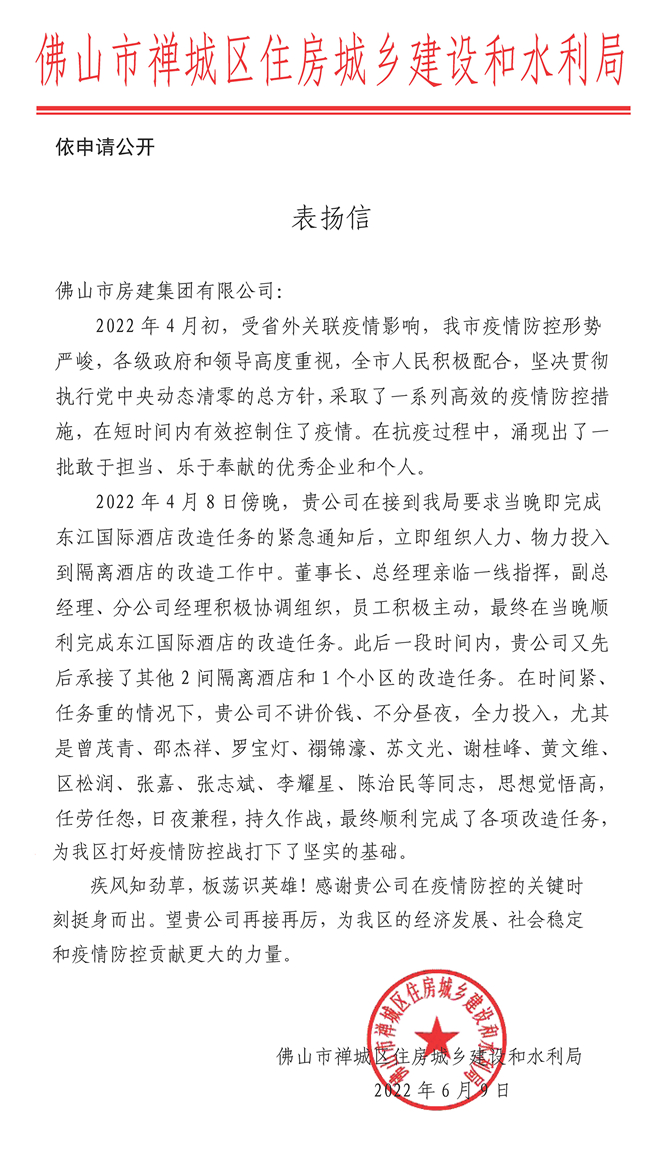 佛山房建集团扎根佛山65载,我们不仅注重企业自身发展,更将社会责任融入到ky88棋牌官网的文化建设中,做有温度有担当的企业。过去的2022年新冠疫情肆虐,我们勇当“抗疫急先锋”,为我市疫情防控工作派遣相关人员逾1000人次,涉及高速公路口疫情防控、多个防疫隔离酒店改造建设等防控工作;东西部协作大潮,我们积极响应,派遣青年工程师前往支援;人民群众有困难,我们大力捐资赠物,解燃眉之急。